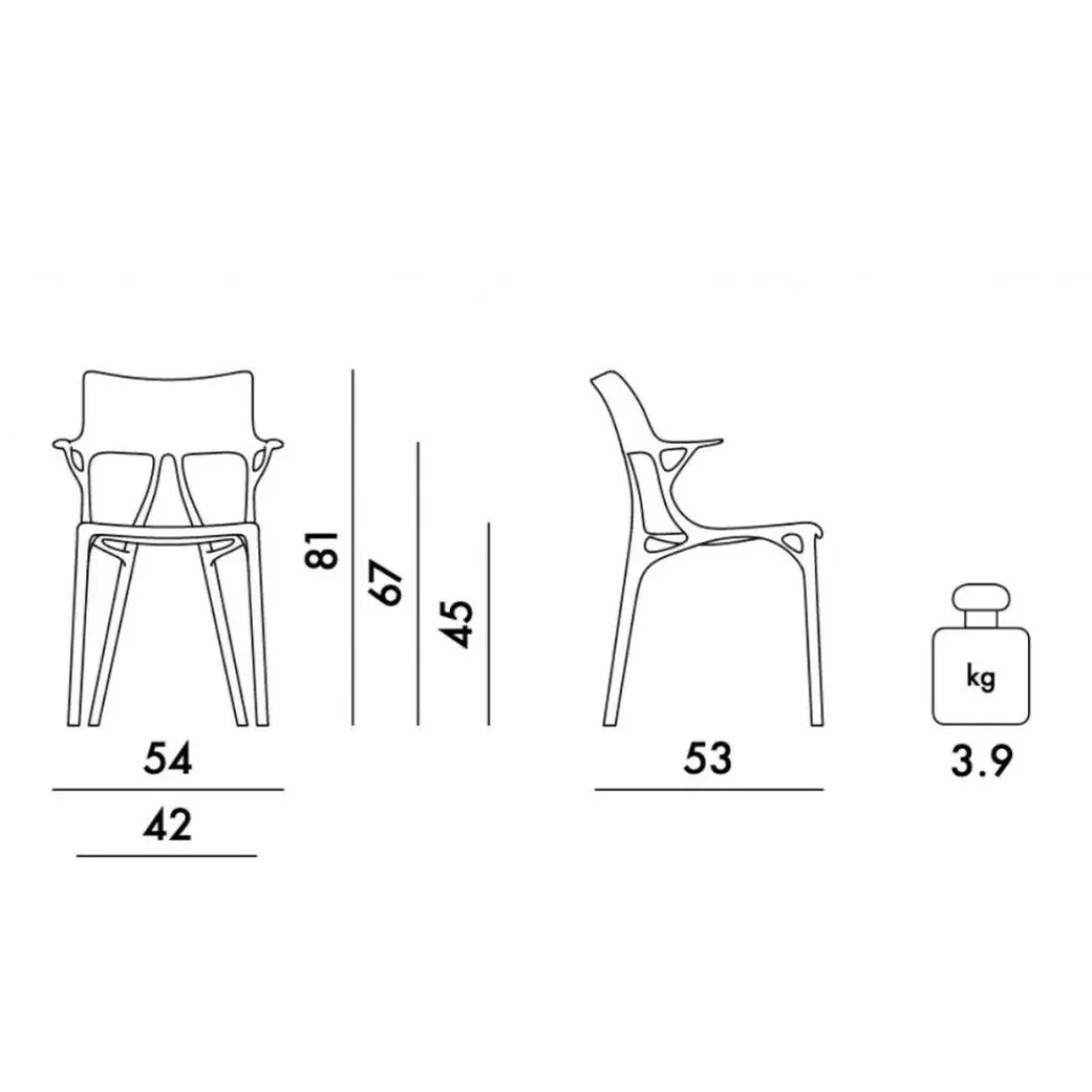 Der in verschiedenen Farben erhältliche AI Metal Armlehnstuhl ist nur 3,9 kg schwer. Somit kann er leicht von einem Ort zum anderen transportiert werden. Der Stuhl ist 81 cm hoch und 54 cm breit. Die Tiefe beträgt 53 cm und die Sitzhöhe 45 cm. Das innovative Modell, das aus einem Guss gefertigt ist, wird mit seinen beiden schräg angesetzten Hinterbeinen zum unverwechselbaren Kultobjekt.