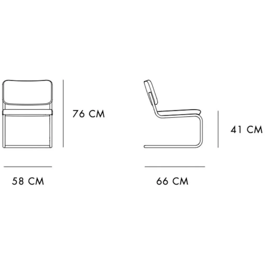 Der S 32 PVL Freischwinger Lounge Stuhl Leder hat ein Gewicht von 7,2kg. Die Sitzhöhe beträgt 41cm. Mit einer Breite von 58cm bietet das Modell viel Komfort in jeder Sitzhaltung. Es ist 66cm tief und 76cm hoch. Das Gestell hat unten Bohrungen, um Gleiter aus Kunststoff oder Filz zu befestigen.