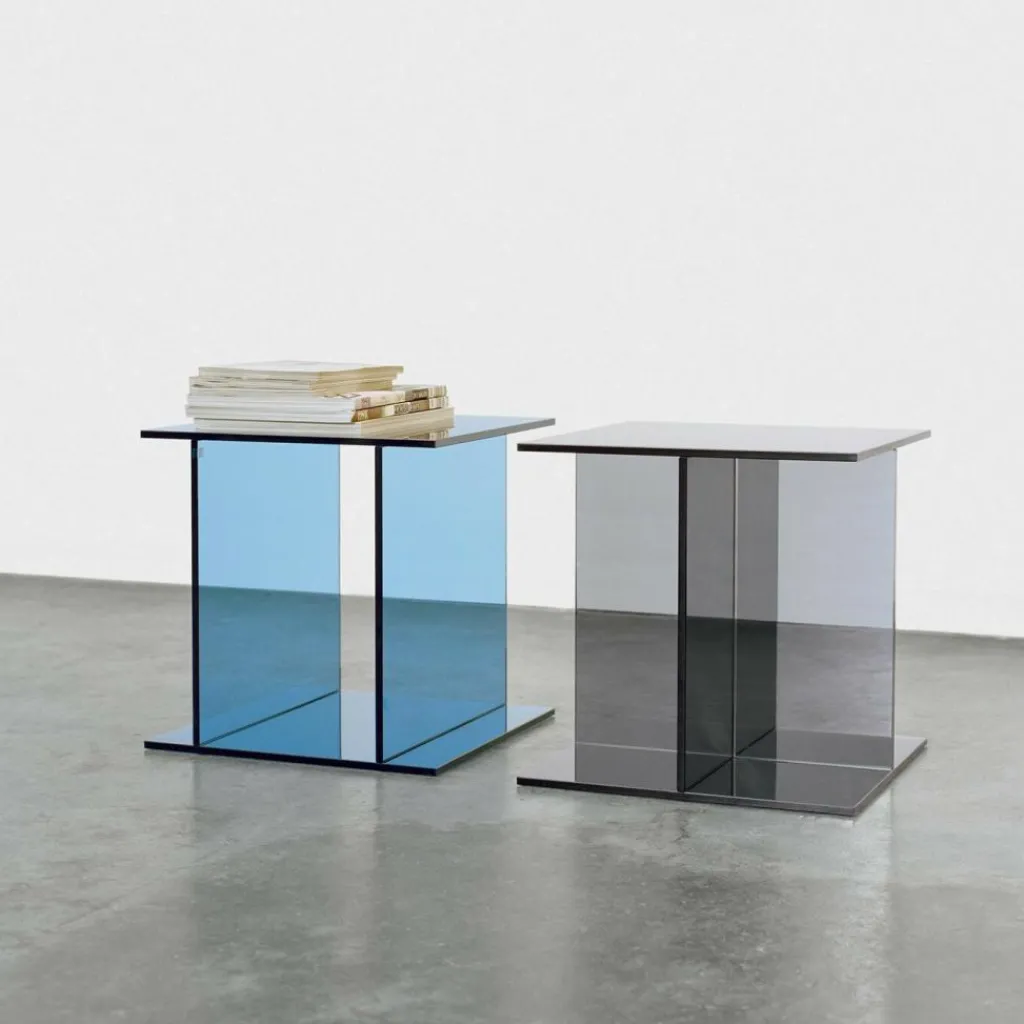 Der 2007 vorgestellte Drei Beistelltisch gehört zum hauseigenen Sofasystem Shiraz, das in seiner Gesamtheit eine aufregende Verschmelzung zwischen Orient und Okzident veranschaulicht. Der Beistelltisch besteht aus vier gläsernen Platten, die durchgehend eingefärbt sind. Die offene Gestaltung und die potenzielle Verwendung des kleinen Tisches in zwei unterschiedlichen Positionen nehmen Bezug auf das klassische Bauhaus und die Entwürfe der Moderne, die Europa zu Beginn des 20. Jahrhunderts prägten. Gleichzeitig weist die Verwendung des bunten Glases in den Osten und setzt sich damit materialtechnisch mit den Errungenschaften eines anderen Kulturkreises auseinander. Der Drei Beistelltisch ist trotz seiner zahlreichen Interpretationen ein grafisches Möbelstück, das in seinen Umrissen einem Quadrat mit der Seitenlänge von 40cm folgt. Ob neben dem Bett oder neben der Couch – genießen Sie das Spiel mit den Gegensätzen!