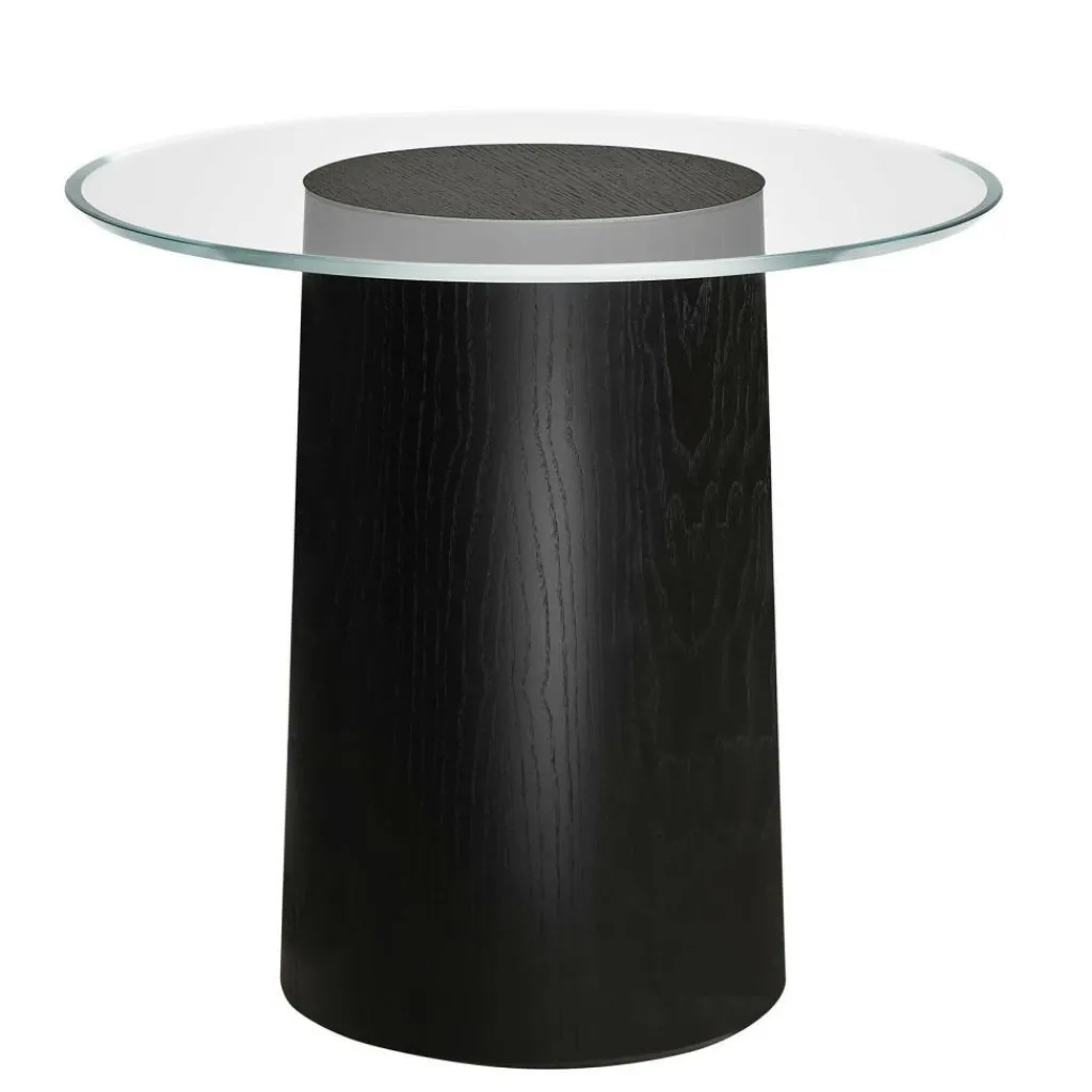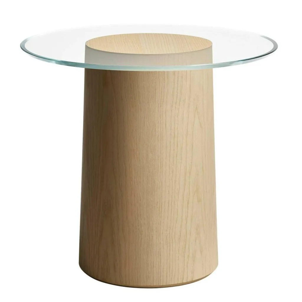 Bewusst entscheidet sich Schelde für einen Mix aus traditionellen Materialien und reduziert das Design dabei auf ein Minimum: Der solide Tischfuß besteht aus einem Kern aus Eschenholz. Darüber ist eine Schicht Furnier angebracht, das in verschiedenen Farben erhältlich ist. Zum Blickfang wird der Tisch, weil die durchsichtige Platte scheinbar auf dem Holzstumpf zu schweben scheint. Sie ist ohne sichtbare Halterungen montiert. Die runde Tischplatte besteht aus eisenarmem Floatglas und wird ohne den Einsatz von Kleber auf dem Gestell befestigt. Der Stub Beistelltisch Esche ist sehr pflegeleicht: Die Glasplatte kann mit einem trockenen Tuch oder bei stärkerer Verschmutzung mit einem Glasreiniger geputzt werden. Auch der Sockel lässt sich gut mit einem feuchten Tuch reinigen.