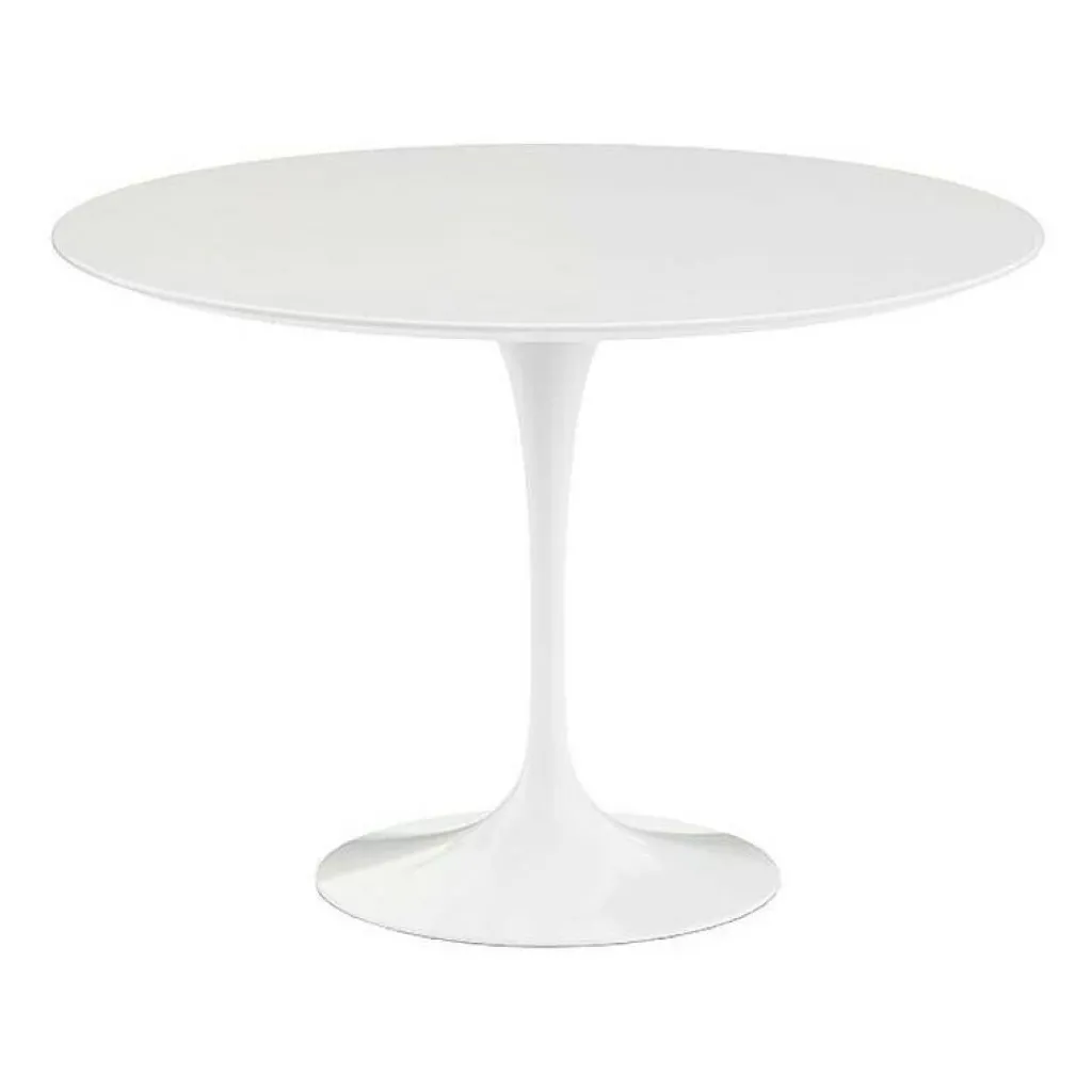 Der Saarinen Esstisch Ø107cm von Knoll International besteht aus einem Aluminium-Tulpenfuß, weiß oder schwarz beschichtet. Die Platte des Tisches ist aus Marmor oder Laminat gefertigt.