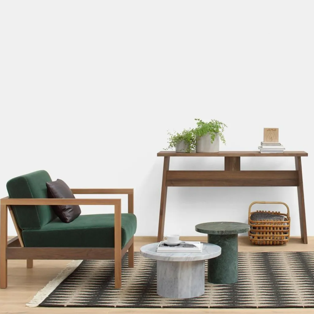 So ikonisch präsentiert sich auch das Drayton Konsole, das 2015 erstmals gezeigt wurde und sich dagegen weigert, als bloße Abstellfläche zu gelten. Die charaktervolle Mittelzarge mit der Breite von 35cm dominiert das 85cm hohe Möbelstück und unterstreicht das strukturelle Konzept der Konsole. Daneben überwiegen die geradlinige Form und der klare Designansatz, die sich hervorragend in moderne Interieurs einfügen. Ganz gleich, ob Sie das stilvolle Konsole im minimalistischen Wohnzimmer als eines der wenigen Möbelstücke richtig in Szene setzen oder dieses Möbelstück im Office als Blickfang und praktische Abstellfläche für Kunstobjekte oder Sporttrophäen nutzen möchten – die natürliche Fertigung und das bodenständige Erscheinungsbild sorgen dafür, dass die Konsole elegant und zurückhaltend wirkt. Das 140cm lange Drayton Konsole ist aus massivem Nussbaumholz aus deutschem Anbau gefertigt und mit einer geölten Oberfläche versehen. Die natürliche Maserung des Holzes macht aus jedem Exemplar dieses Möbels ein individuelles Einzelstück mit viel Charakter und Sinn für das Besondere.