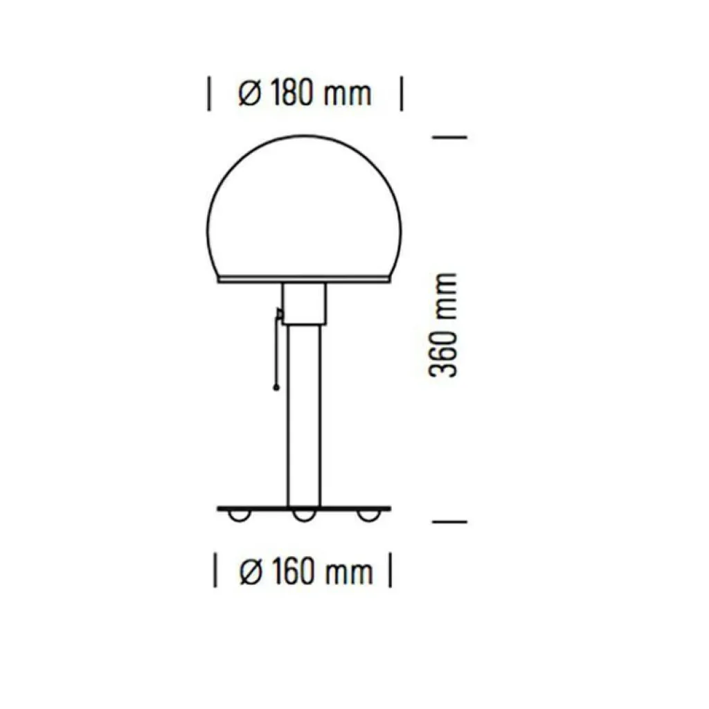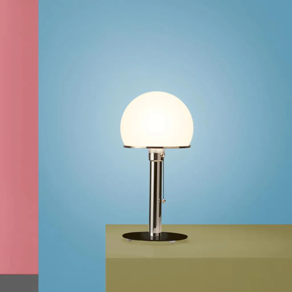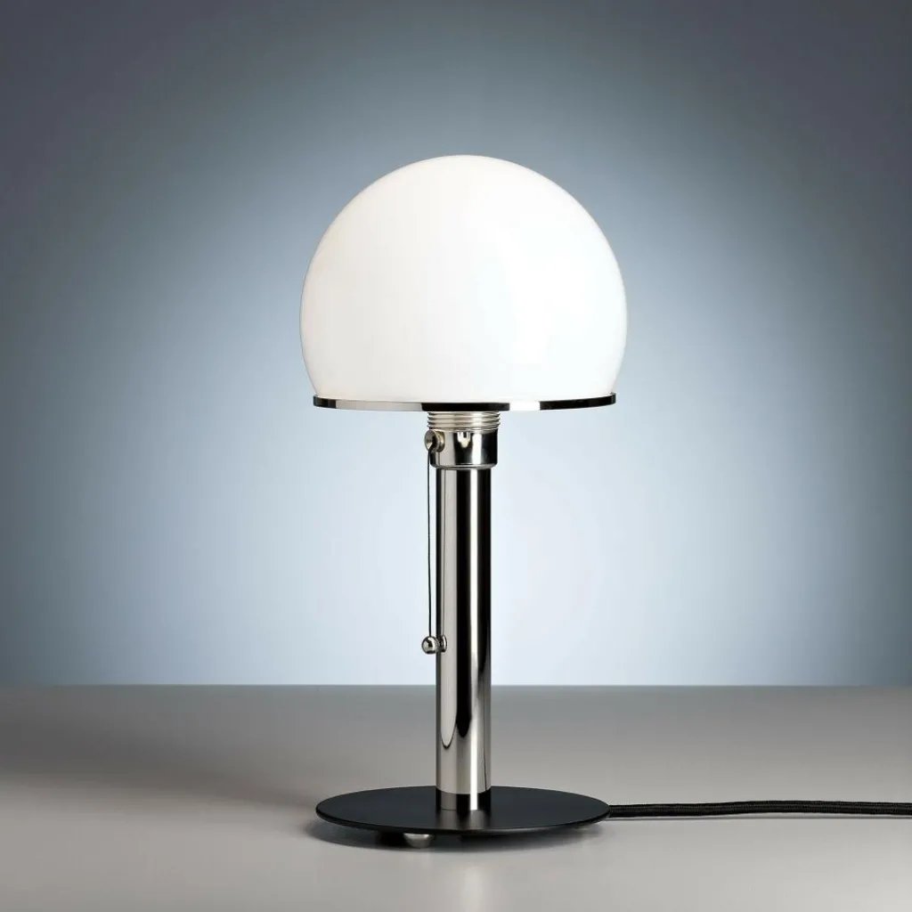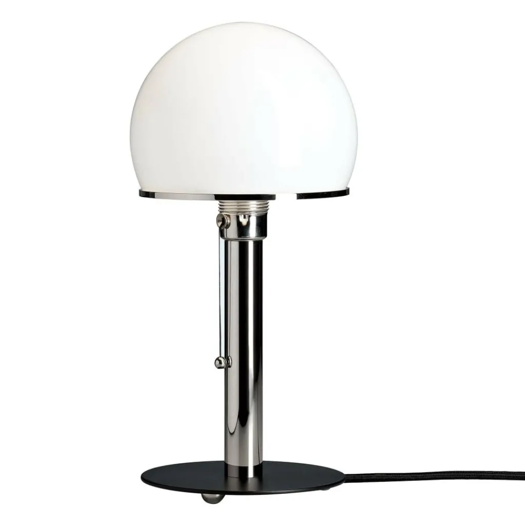 Bei der Gestaltung der Wagenfeld WA 23 SW Tischleuchte blieb Wagenfeld dem Grundsatz Form folgt Funktion treu. Obwohl sie im typischen Industriedesign gefertigt ist, wurde die Leuchte von Beginn an in Handarbeit hergestellt. Der Klassiker gehört heute zur Dauerausstellung des Museum of Modern Art in New York. Genau wie der Prototyp aus dem Jahr 1924 sorgt auch heute noch eine runde Scheibe aus Metall für sicheren Stand. Daraus erhebt sich ein Metallstab. Oben ist eine kleine Schnur befestigt, an deren Ende eine vernickelte Metallkugel hängt. Sie Schnur dient zum Ein- und Ausschalten. Der halbrunde Schirm aus mundgeblasenem Opalglas hat einen Metallrand.