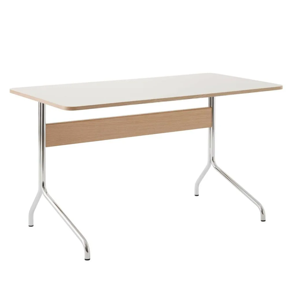 Beim Pavilion AV16 Schreibtisch Gestell chrom handelt es sich um ein schlicht gestaltetes Möbelstück, das sich harmonisch jedem Umfeld anpasst. Es integriert sich in ein Home-Office genauso gut wie in ein Büro. Markant ist das Gestell aus glänzendem Stahl. Es besteht aus zwei Stahlrohren, die im unteren Teil in einem Bogen zu jeweils zwei Standfüßen führen. Im oberen Drittel ist eine Holzlatte befestigt, die für zusätzliche Stabilität sorgt. Die Tischplatte besteht aus lackiertem Eichenholz, das mit einer Schicht Linoleum versehen ist. Sanft abgerundete Ecken tragen zum harmonischen Erscheinungsbild des Tisches bei.