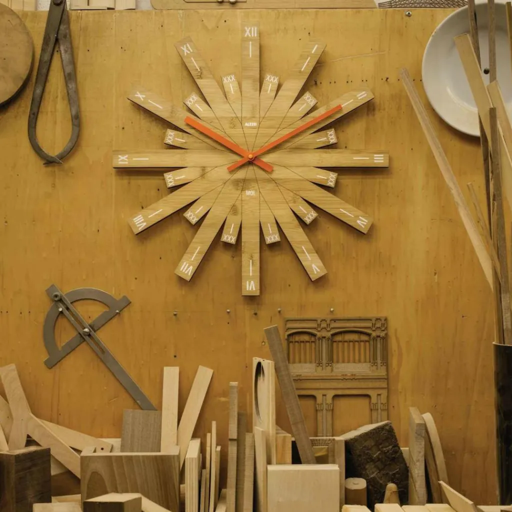 Die Raggiante Wanduhr wurde von Michele de Lucchi für den Hersteller Alessi entworfen. Die Uhr in Sonnenform besteht aus echtem Bambusholz und hat Zeiger in knalligem Orange. Der Begriff „raggiante“ bedeutet auf Italienisch „strahlend“, was offenkundig auf die Form der Uhr übertragen werden kann. Zwölf lange und kurze Strahlen zeigen die vollen Stunden und deren Halbzeiten an. Die Uhrzeiten sind in römischen Ziffern in weißer Farbe aufgedruckt, wodurch die Uhr einen sehr modernen Charakter erhält.