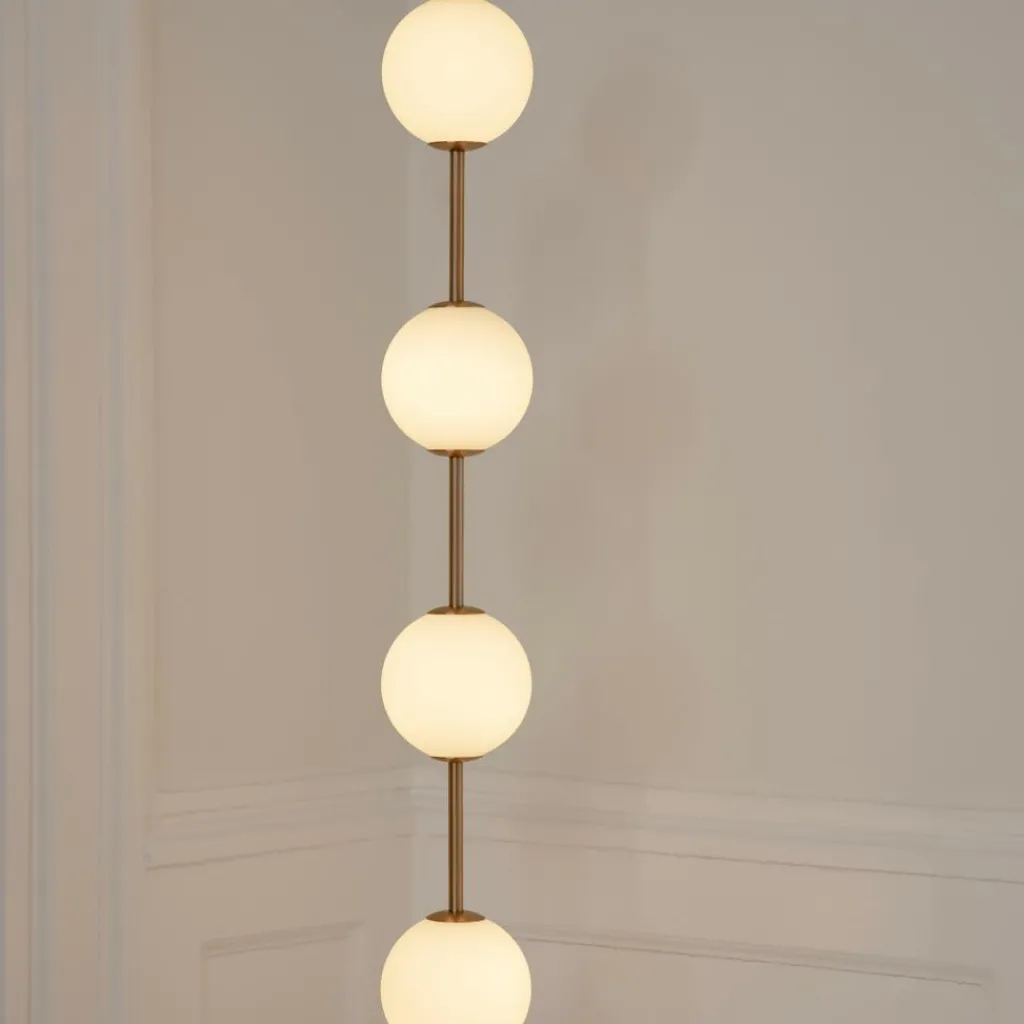 Wie ein zierliches Schmuckstück steht die Audrey LED Stehleuchte da, deren vier übereinandersitzende Leuchtenschirme wie locker aufgefädelte Perlen erscheinen. Sie bestehen aus Opalglas und sind in Aluminiumschalen eingefasst. Die Metallelemente zwischen den kugeligen Diffusoren zeigen ebenso wie die scheibenförmige Leuchtenbasis einen matten Metallschimmer. Vier Füße aus Stahl sorgen für einen stabilen Stand der Designleuchte. Die Audrey LED Stehleuchte gibt ein warmes, weiches und blendfreies Licht, das gleichmäßig in alle Richtungen strahlt. Ihr dimmbarer Lichtschein eignet sich als stimmungsvolle Raumbeleuchtung. Sie kann in einer Ecke oder mitten im Raum stehen und passt in einen repräsentativen Raum am Arbeitsplatz, in eine edle Bar, die Lobby eines Designhotels und ins Wohnzimmer daheim.
