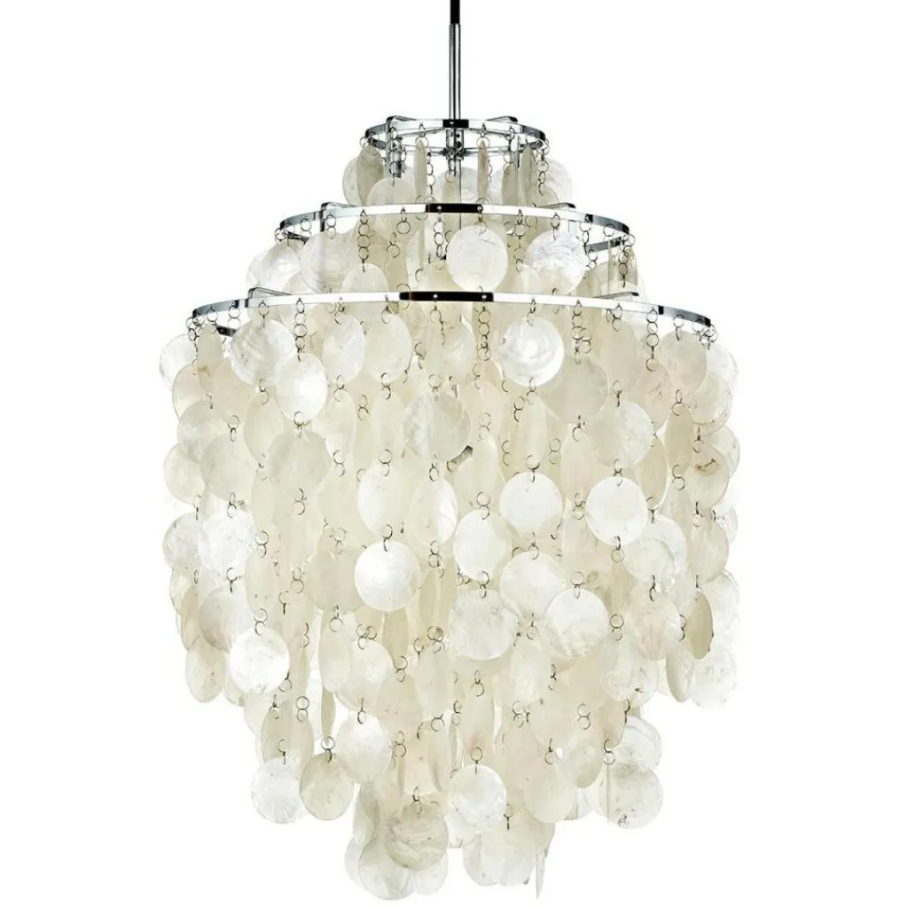 Drei Reifen aus Chrom bilden das Gerüst der Fun 1DM Pendelleuchte. Sie sind unterschiedlich groß und in Stufen mittig über dem Leuchtmittel angeordnet. Daran aufgehängt sind verschieden lange Ketten mit runden Perlmuttplättchen, die an kleinen Metallringen beweglich aneinanderhängen. Die Muschelketten auf dem kleinsten und am höchsten positionierten Reifen sind die längsten, jene auf dem größten und unteren Reifen haben nur wenige Glieder. Dadurch erhält die Fun 1DM Pendelleuchte die Form eines gleichmäßigen Ovals. Sie erzeugt ein angenehm diffuses Licht, das bei Bewegung der Glieder changiert.