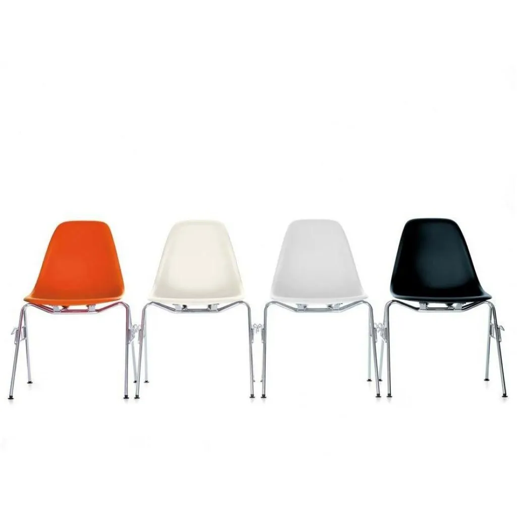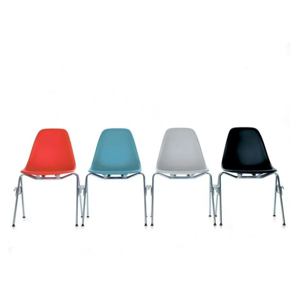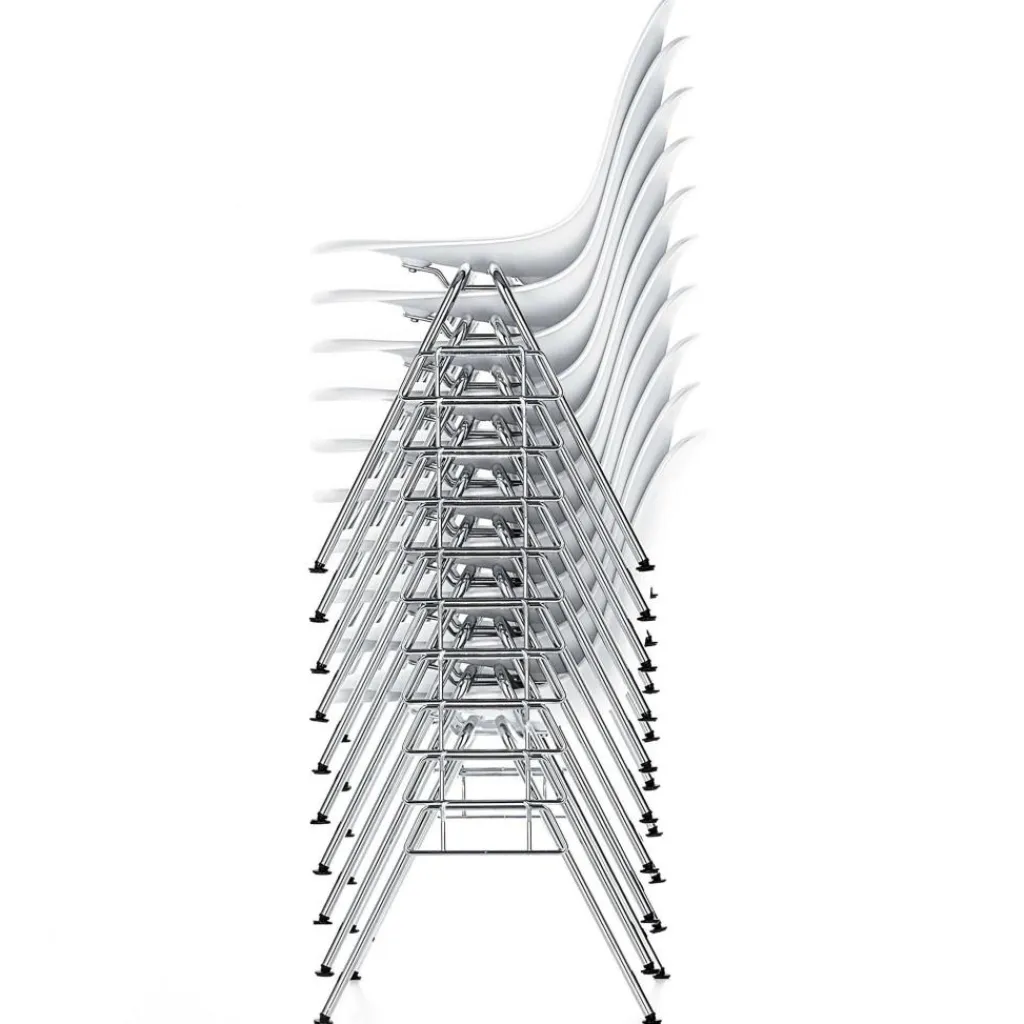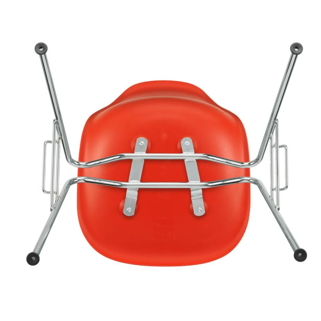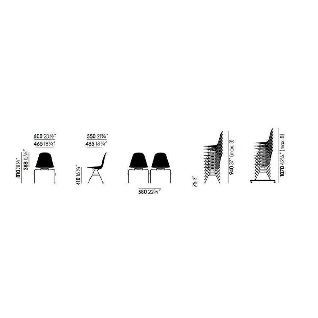 Der Eames Plastic Side Chair DSS RE Gestell verchromt hat eine Breite von 60cm und eine Tiefe von 55cm. Seine Sitzhöhe misst 41cm. Die Gesamthöhe beträgt 81cm. Der Designstuhl wiegt 5,6kg. Es können bis zu acht Modelle des Eames Plastic Side Chair DSS RE Gestell verchromt übereinandergestapelt werden.