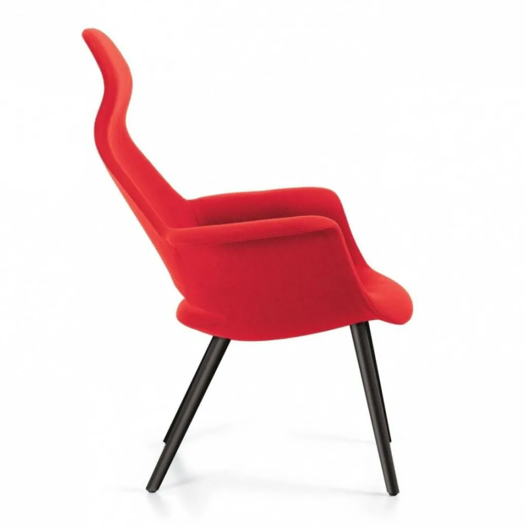 Das Gestell des Organic Highback Chair besteht aus Holz, die Sitzschale laminiert, die Beine aus Esche schwarz. Eine Polsterung aus Polyurethanschaum und die leicht nach hinten geneigte, hohe Rückenlehne inklusive Kopf-/Nackenstütze machen das Sitzen absolut bequem. Der Organic Highback Chair ist mit einem Stoffüberzug versehen.