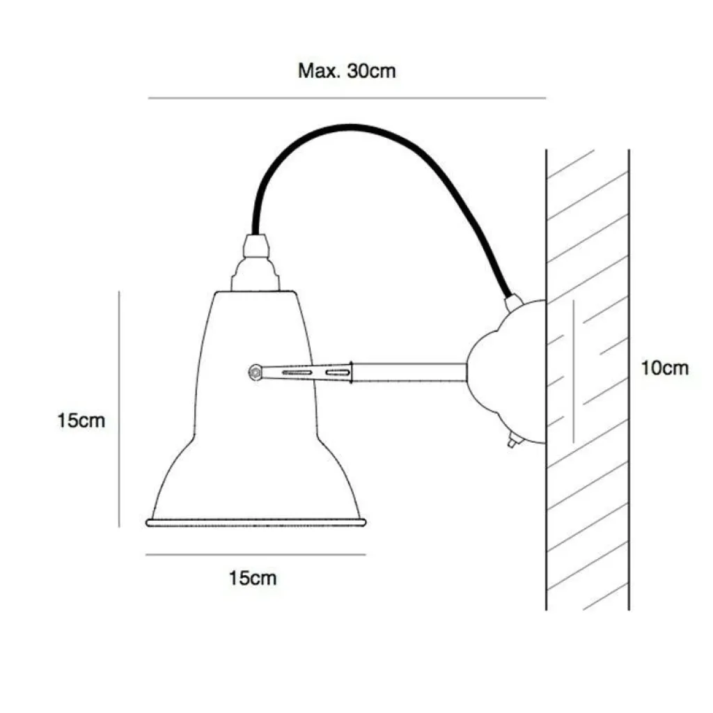 Die Abmessungen betragen 30 cm in der Breite und 15 cm in der Höhe. Der Durchmesser des Schirms ist 15 cm, der des Fußes 10 cm. Durch diese kompakten Maße ist eine unauffällige Installation oder die Anbringung an engen Stellen einfach möglich. Das oben aus der Leuchte herausragende Kabel ist zudem flexibel, was weitere Anpassungen an die Platzverhältnisse ermöglicht. Die Original 1227 Wandleuchte ist in den Farben Leinenweiß und Taubengrau erhältlich, beide bestehen aus lackiertem Stahl und Chrom.