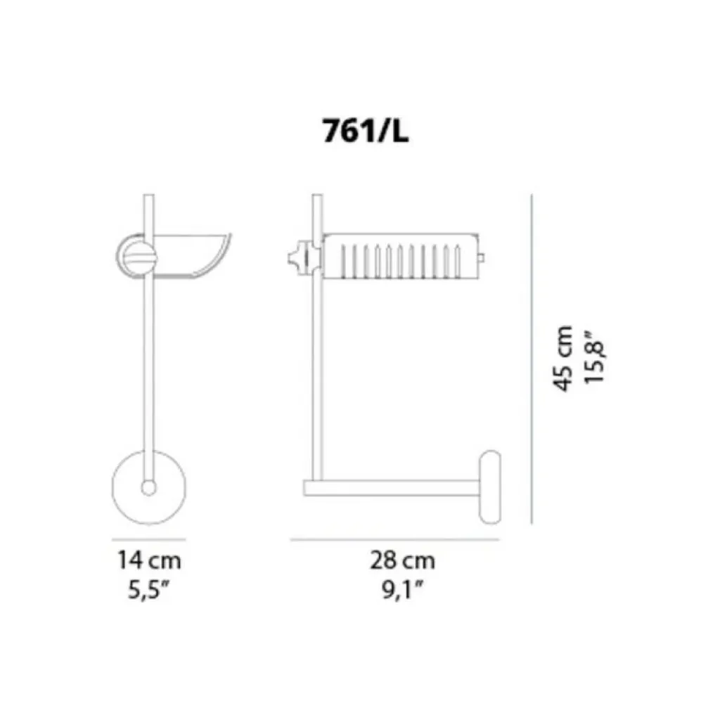 An der Wand montiert wird der Colombo 761/L LED Wandleuchte mit einem Fuß mit 14 cm Durchmesser. Die Leuchte erreicht eine Höhe von 45 cm und eine Tiefe von 28 cm. Die Leuchte enthält ein fix verbautes Leuchtmittel, das nicht getauscht werden kann.